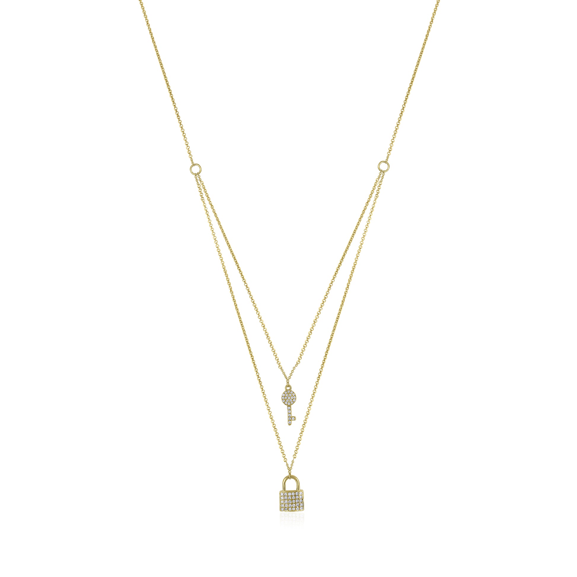 This endearing necklace features a layered lock and key motif comprised of 14K Yellow Gold and a diamond array. Versatile, wear it whenever, wherever.