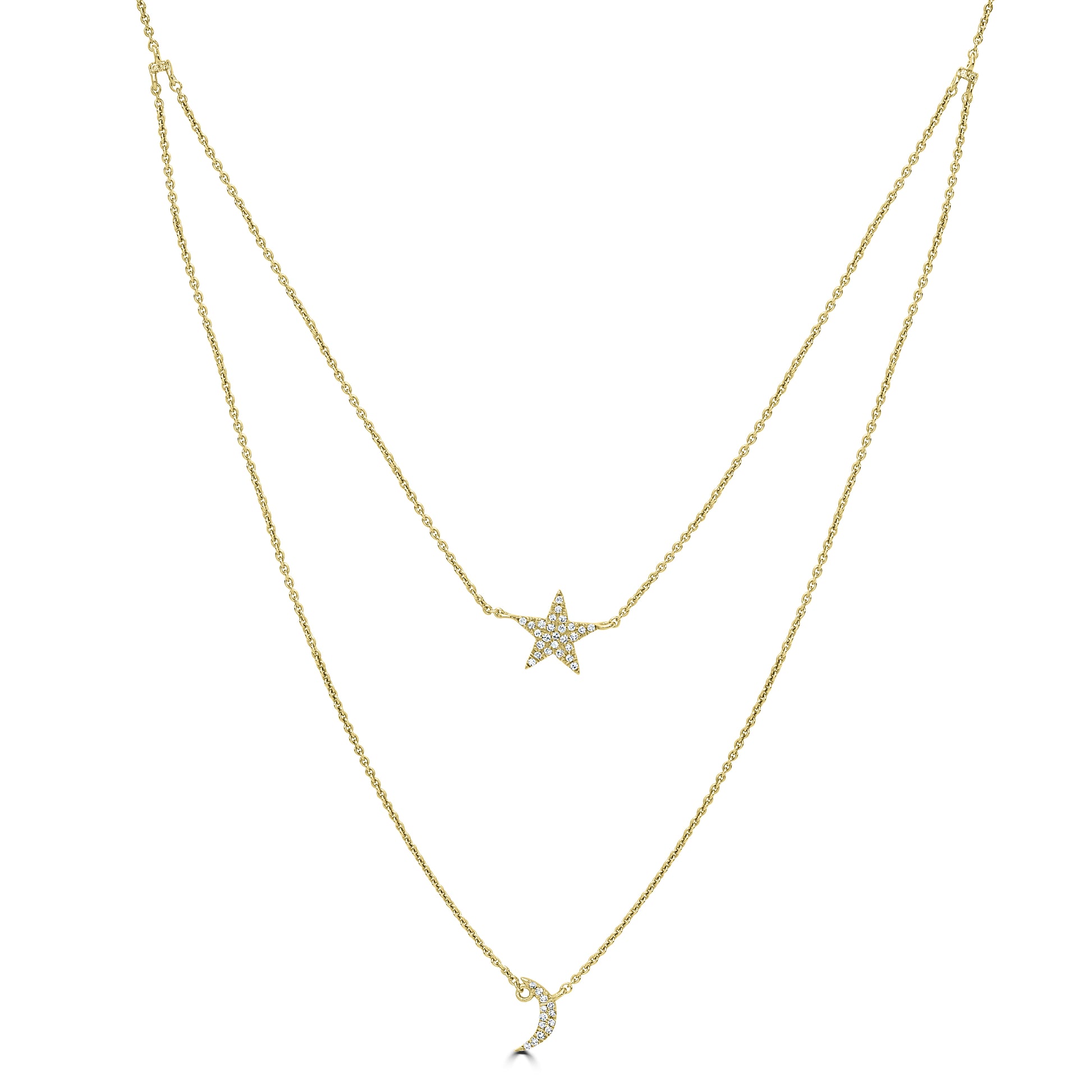 This elegant layered necklace is highlighted by its Diamond adorned star and moon pendants. Sophisticated and fun, make it part of your collection today.