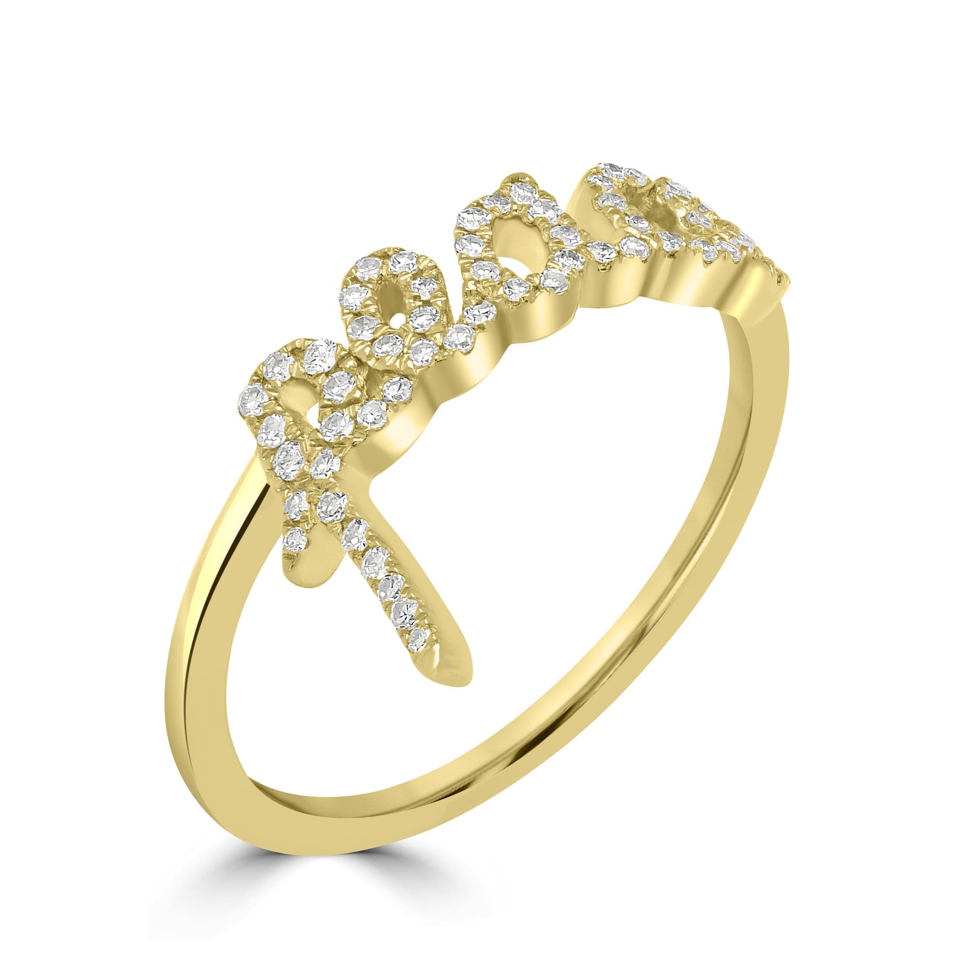 This distinct 14K Yellow Gold ring features pavé Diamonds arranged in the word "Peace." Versatile, the piece can be worn on its own for a bold look or complemented by other rings in your collection.