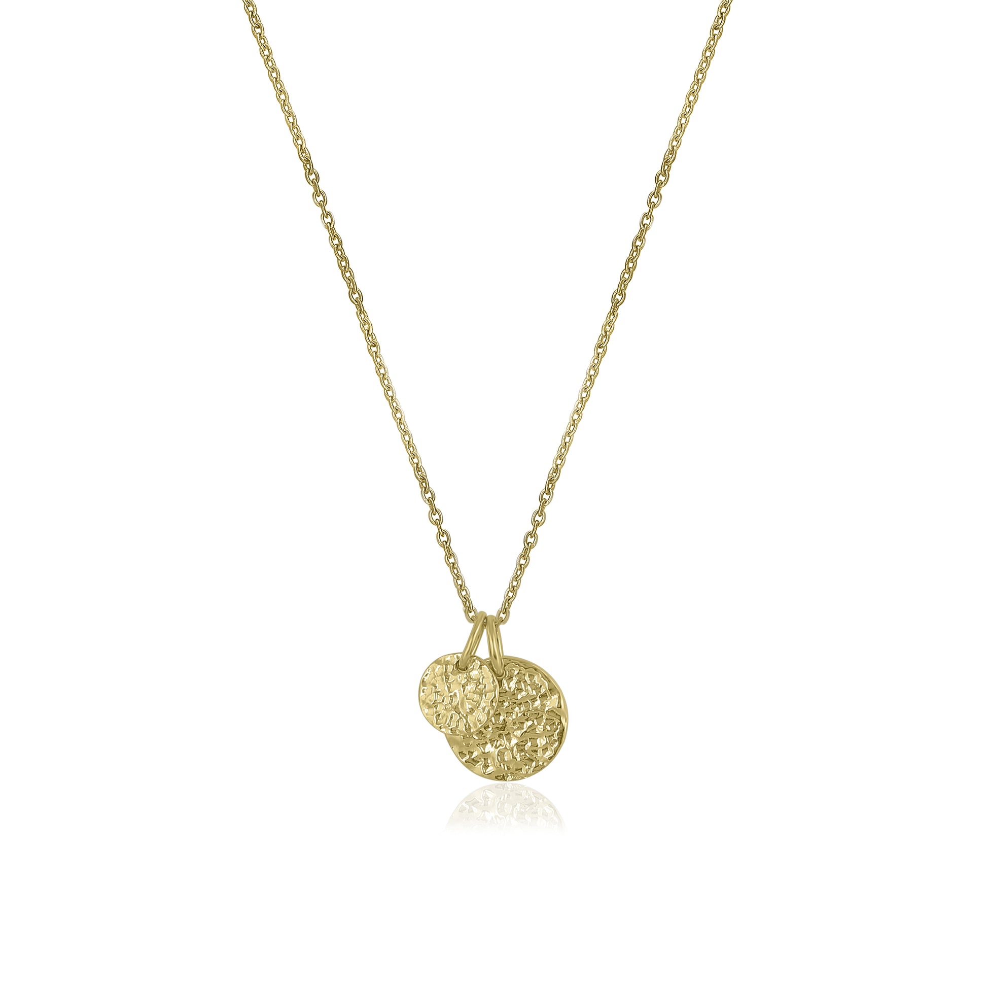 A classic concept reimagined, this piece features two hammered Gold disc pendants suspended from a chain link necklace. Make it a part of your collection today.