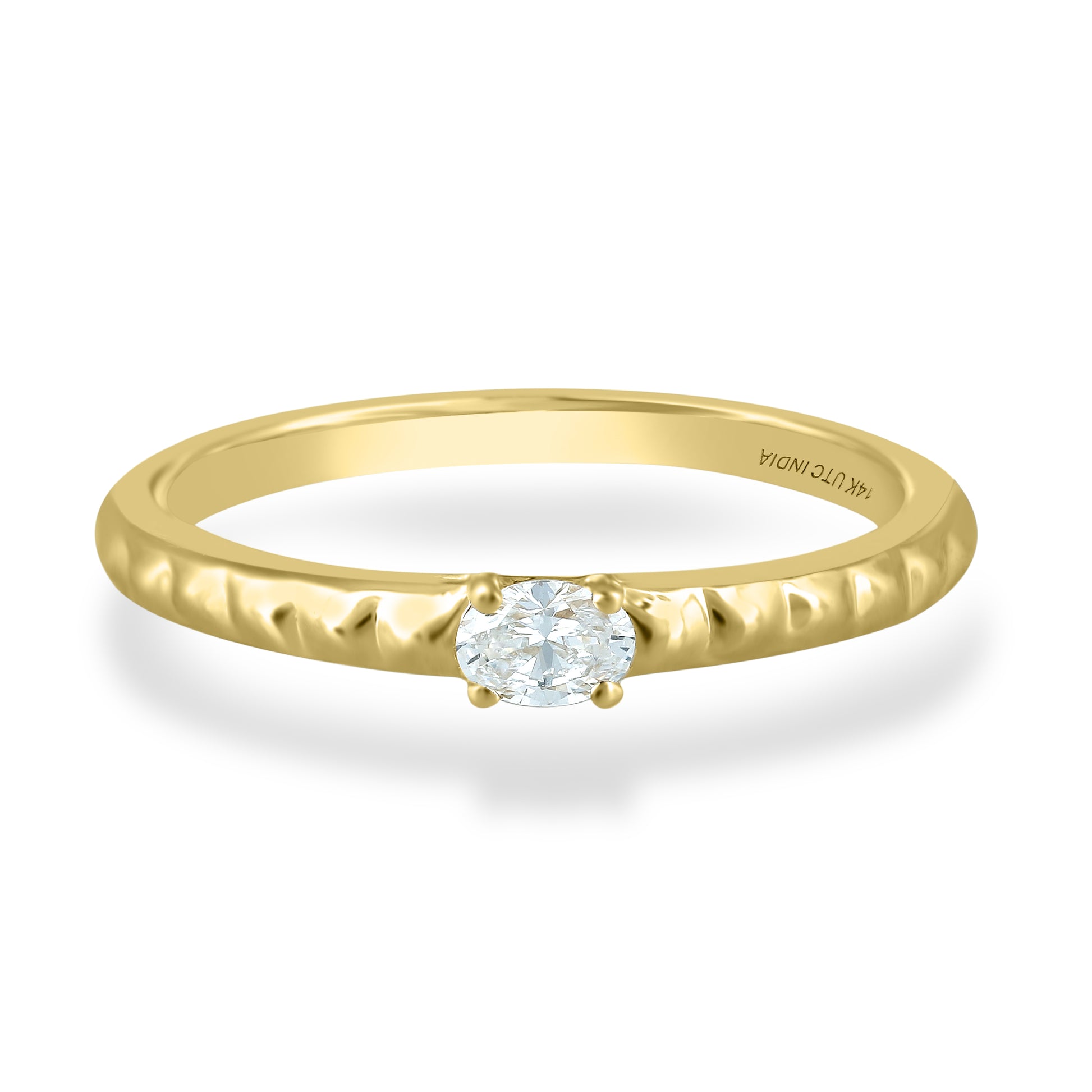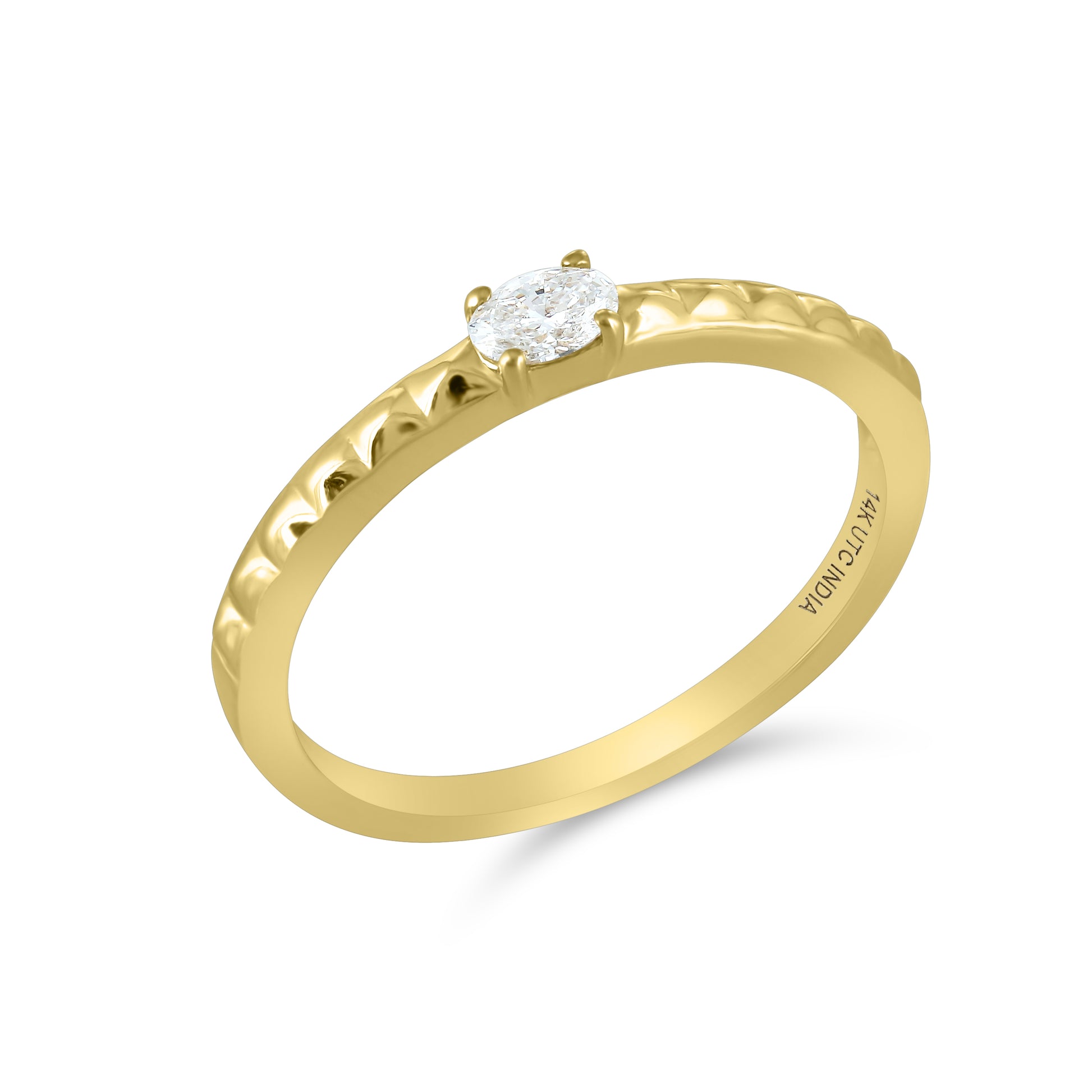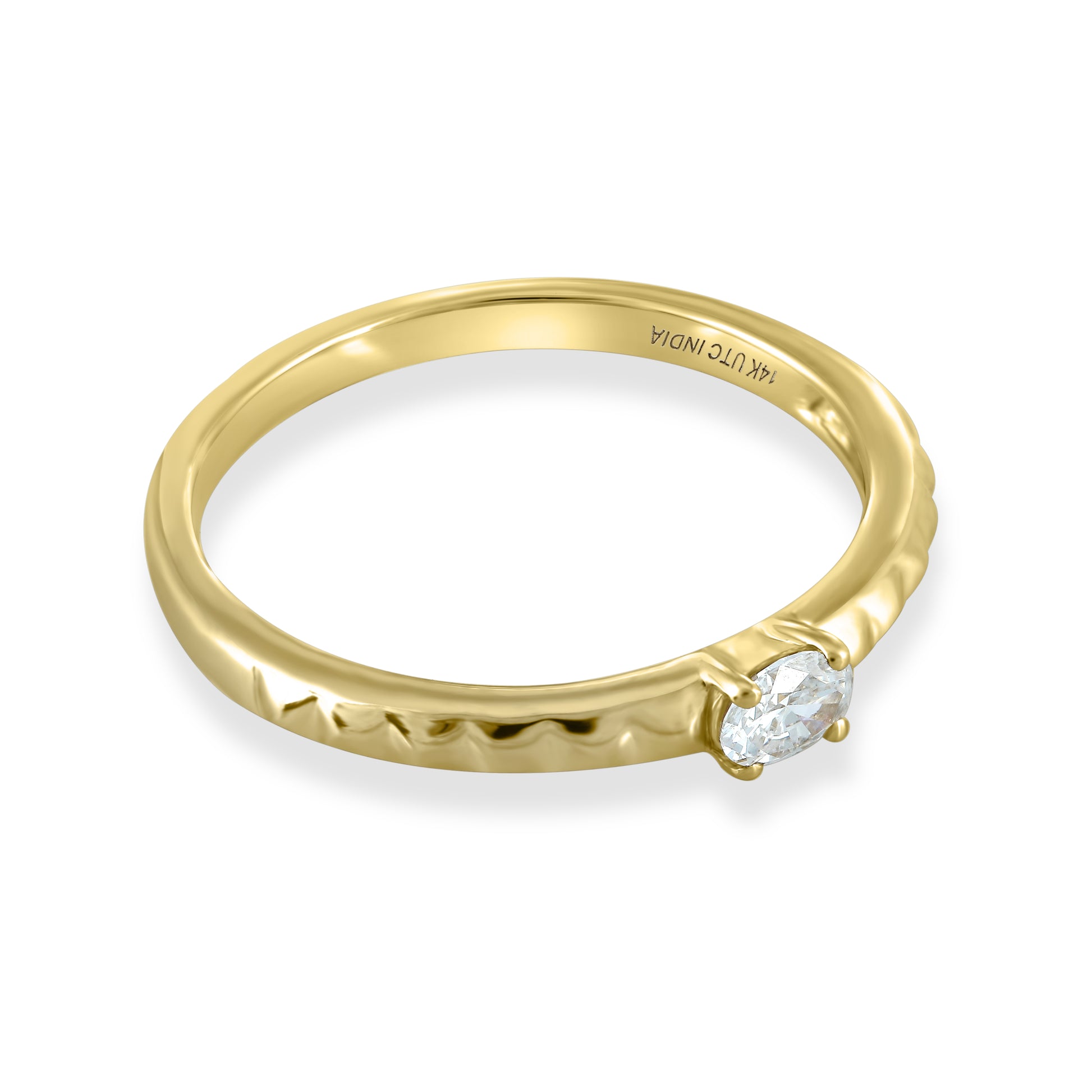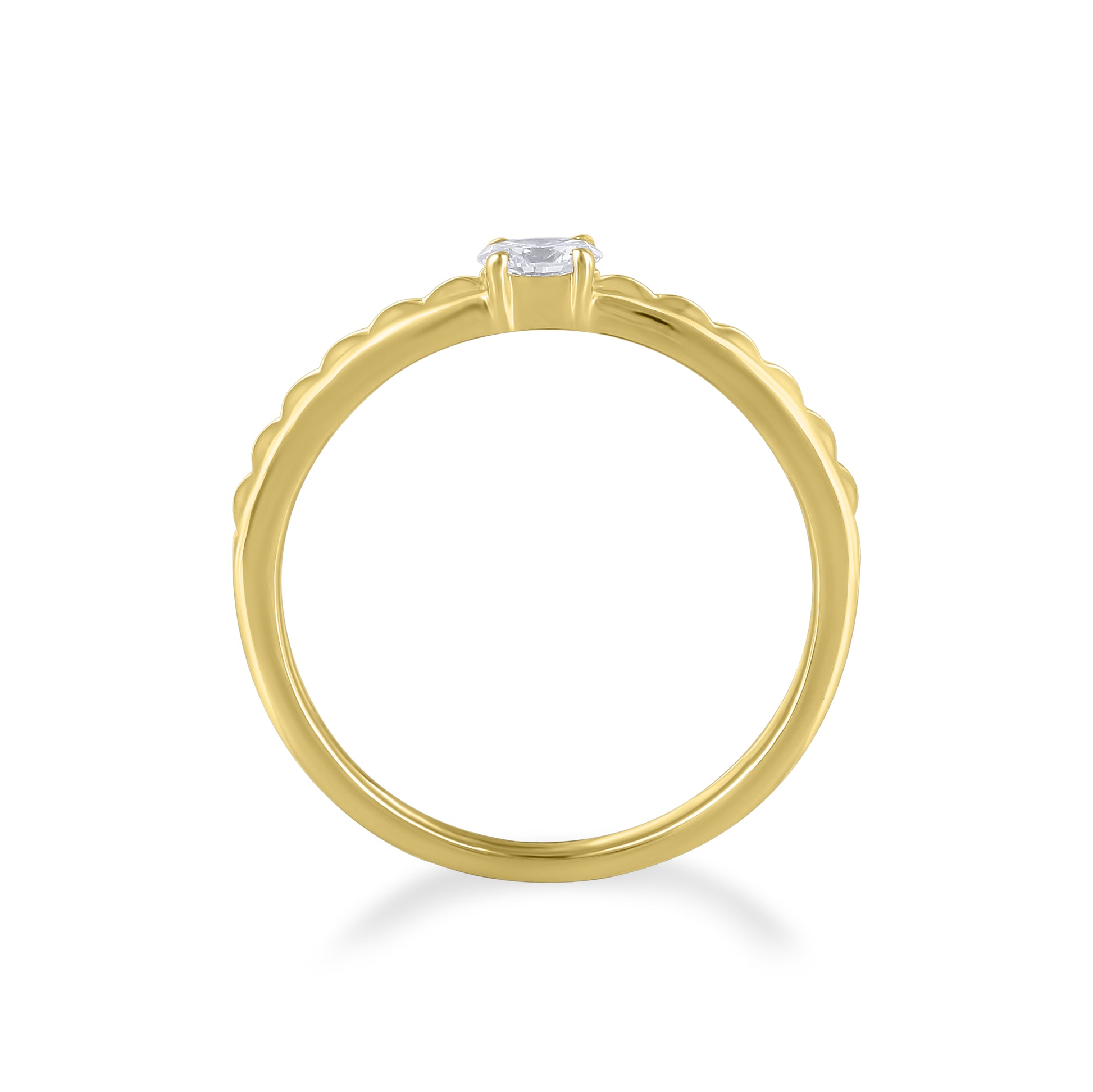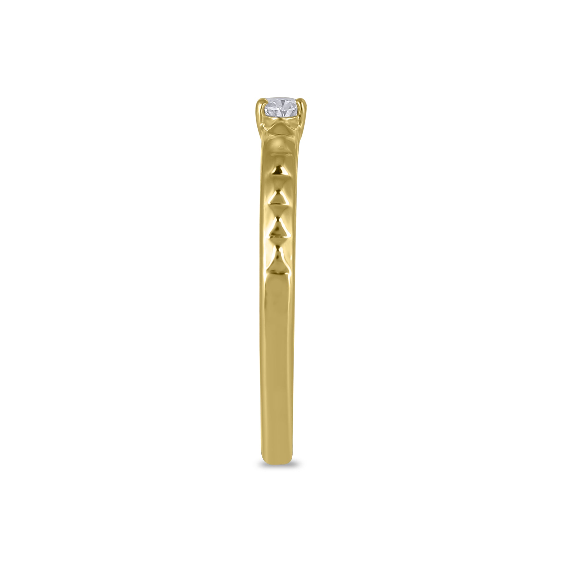 A classic concept refreshed, this 14K Yellow Gold ring features a solitaire Diamond stone complemented by a band with studded texture. Versatile, wear on its own, or stack with other pieces in your collection.