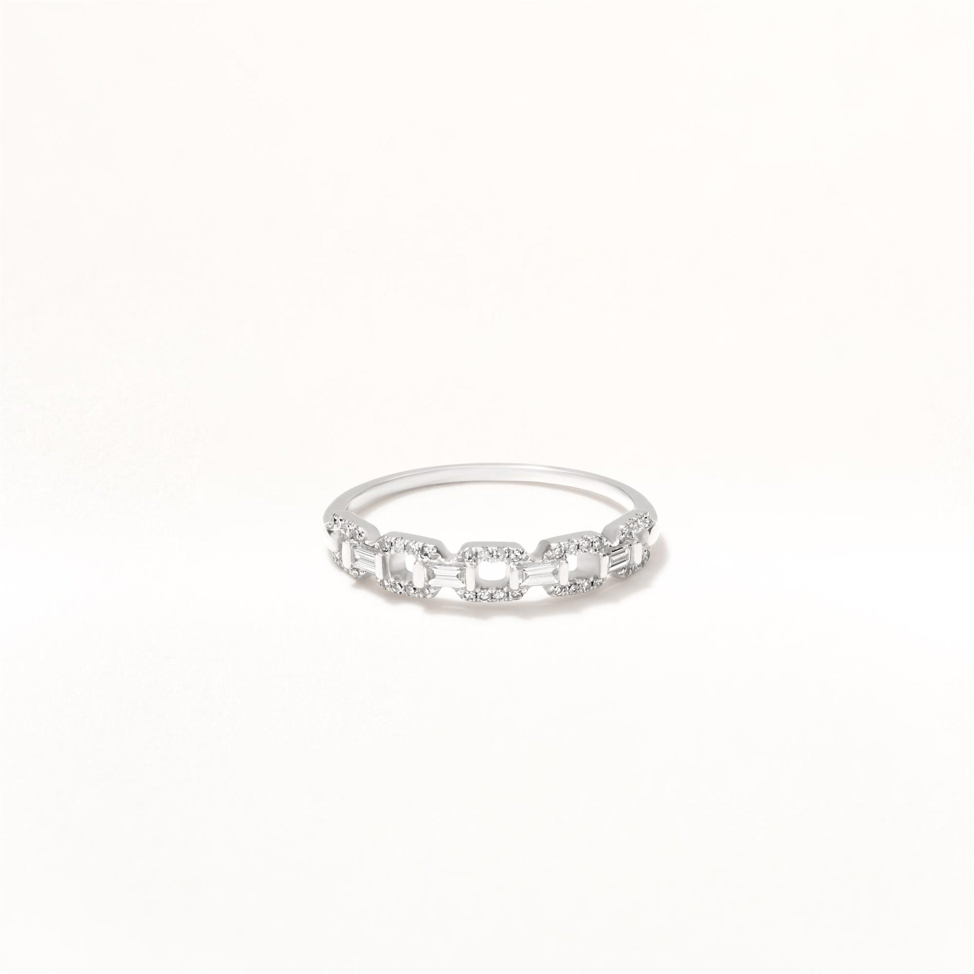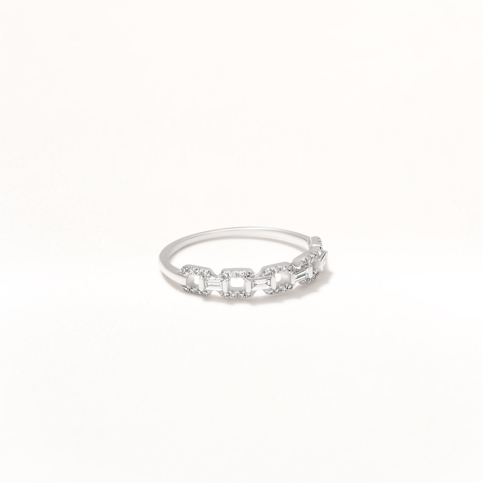 A classic concept refreshed, this 14K White Gold ring features a striking Diamond arrangement complemented by a chain link band. Versatile, wear on its own, or stack with other pieces in your collection.