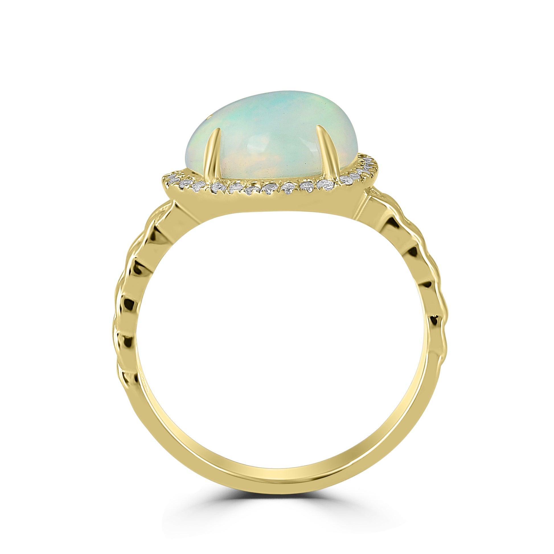 Modern yet timeless, this 14K Yellow Gold ring features a stunning Ethiopian Opal Centerpiece in a Diamond Halo setting.