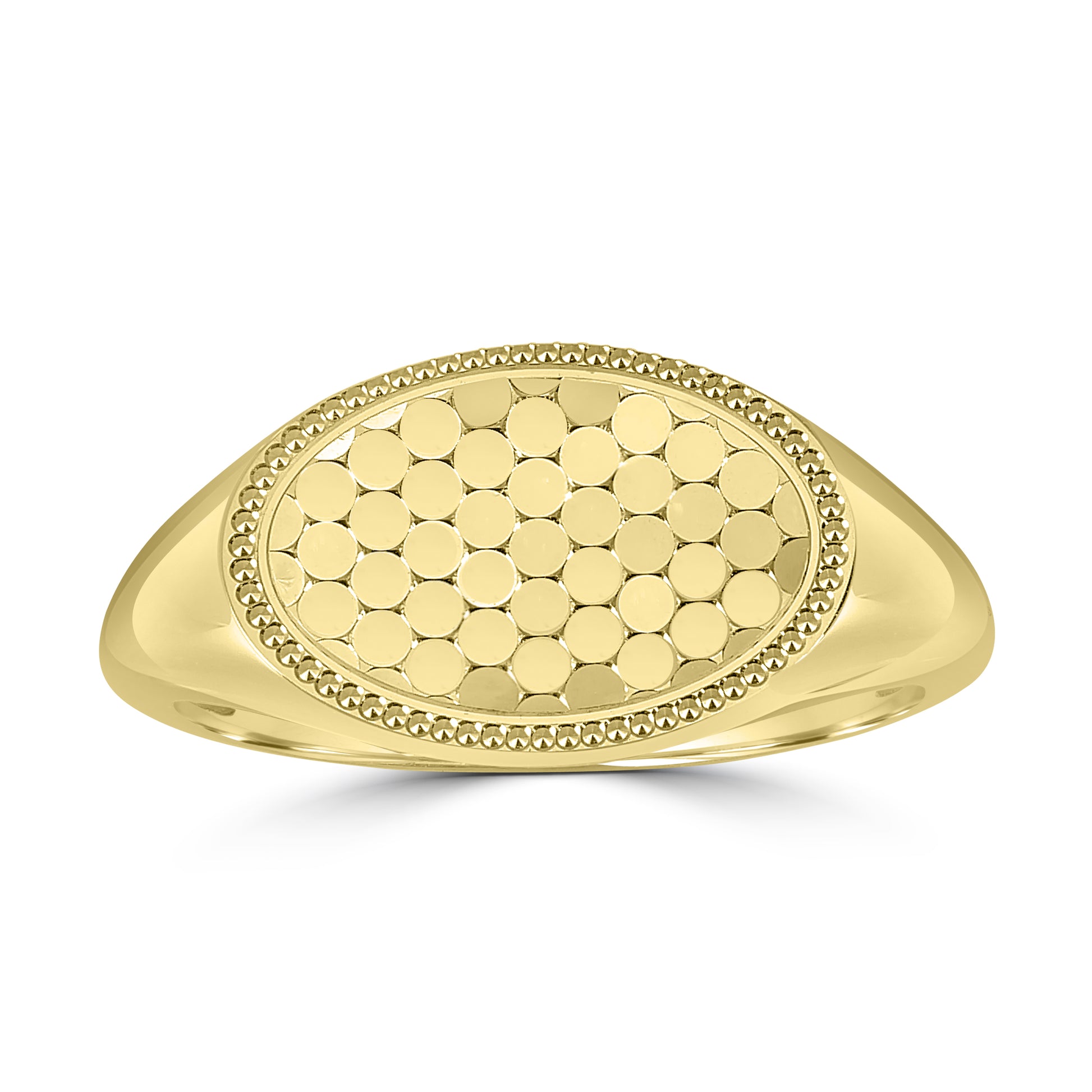 A classic concept refreshed, this 14K Yellow Gold ring features a detailed oval Signet that is sure to stun. Versatile, wear with any ensemble.