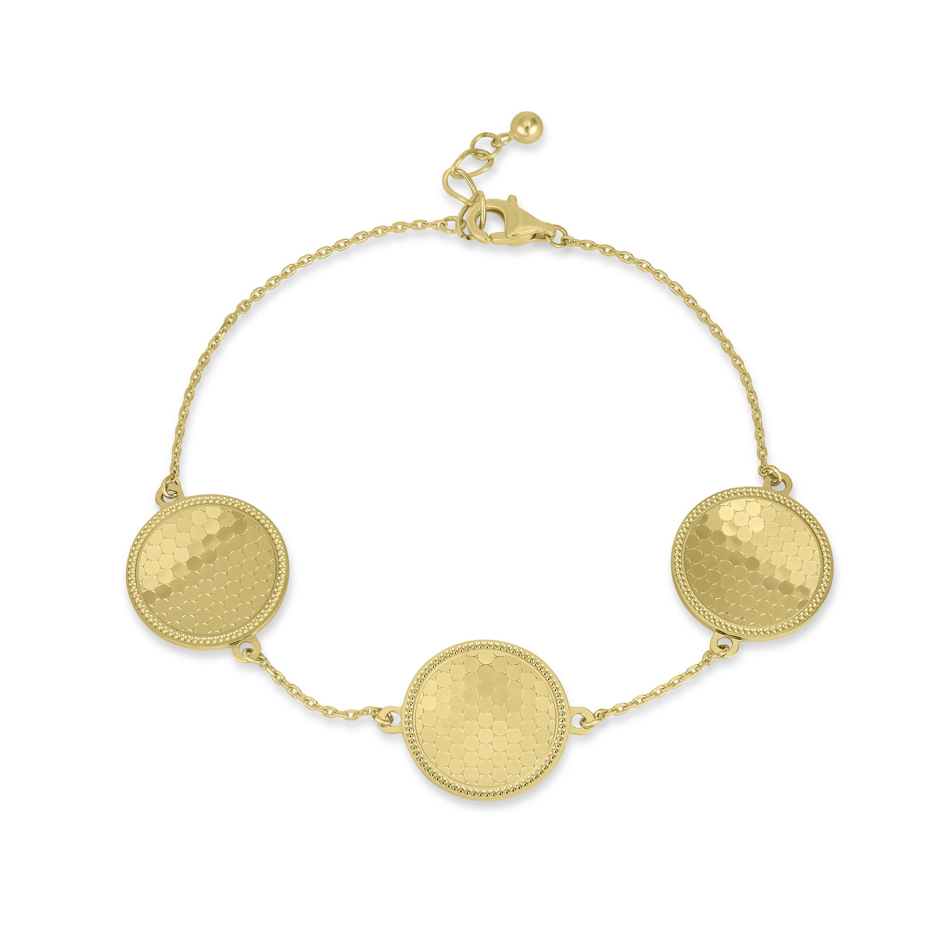 Modern yet timeless, this 14k Yellow Gold bracelet features three intricate medallions suspended from an adjustable chain.