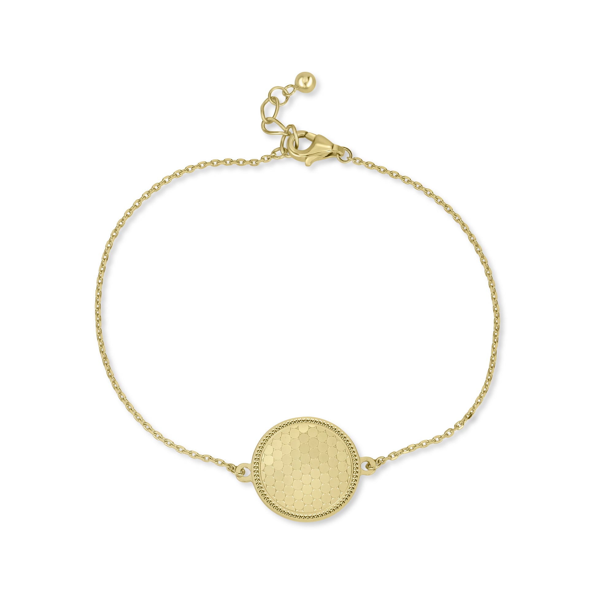 A classic concept refreshed, this 14K Gold bracelet features a detailed medallion suspended from an adjustable cable chain. Versatile, wear with any ensemble.
